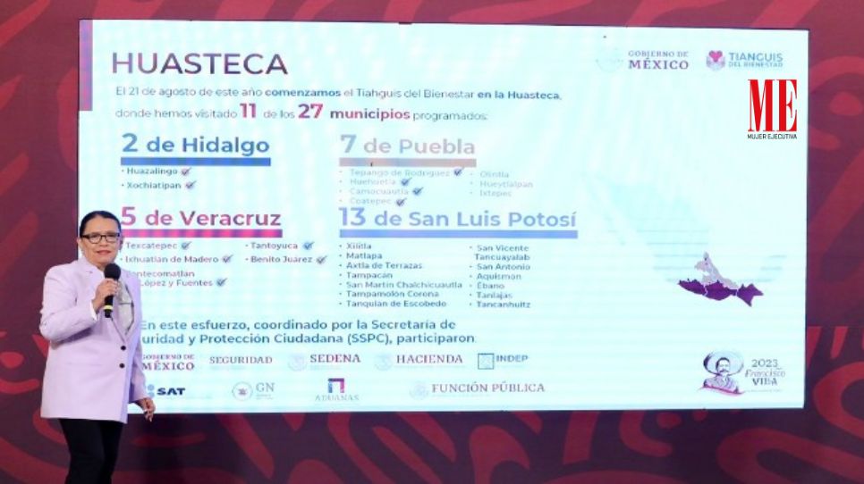 Asímismo, la secretaria Rosa Icela mencionó que, a partir del 21 de agosto de este año, el Tianguis del Bienestar llegó a la región Huasteca y hasta la fecha se han visitado 11 de 27 municipios programados a sus alrededores, con el propósito de apoyar a la población más vulnerable.