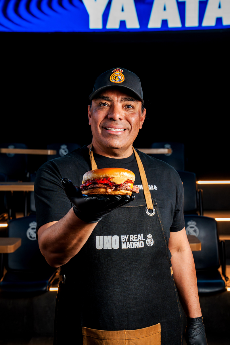 Su colaboración con UNO by Real Madrid rinde homenaje a la fusión cultural entre México y España, combinando dos pasiones universales: la gastronomía y el fútbol. El resultado es la TROMPO BURGER, una creación que mezcla tradición y autenticidad en cada bocado: pan brioche con frijolitos refritos, jugosa carne de res a la parrilla, queso cheddar fundido, carne fileteada de trompo regio al estilo norteño, aderezo de chiles toreados y una capa extra de frijolitos refritos que eleva la experiencia de sabor.